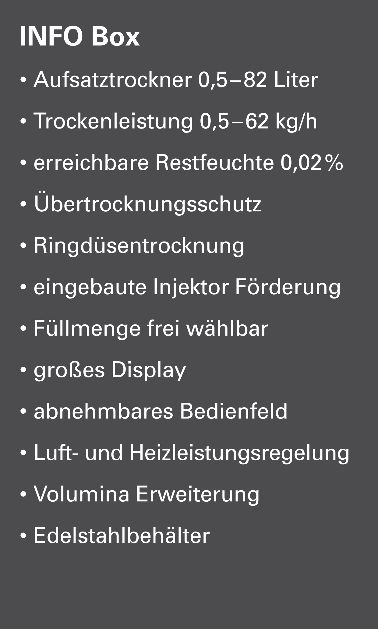gängigen Kunststoffgranulate bis 190 °C effizient und schonend trocknen. Dank seiner kompakten, vollständig aus Edelstahl gefertigten Bauweise